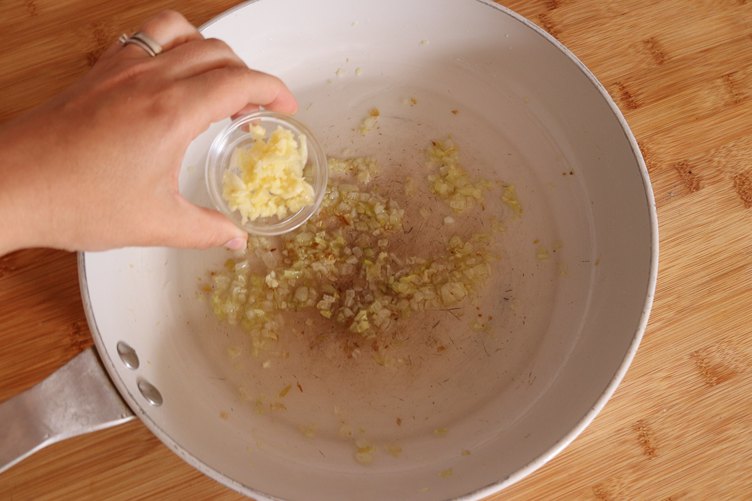 3. Heat up olive oil and fry onions until golden brown and add pressed garlic. Fry for 30 seconds.