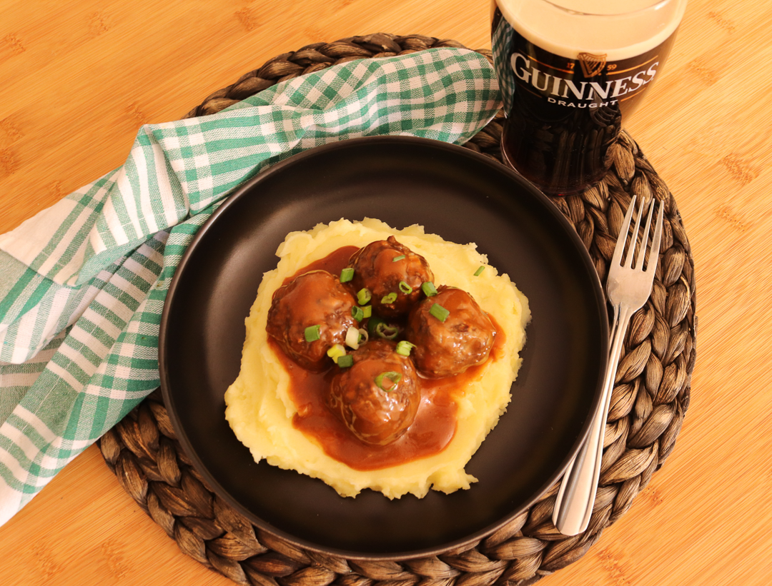 Guinness enriches the sauce with flavour and makes a perfect pairing with meatballs and home-made mash potatoes. The satisfying and warm comfort of meatballs is packed with classic Irish flavours.