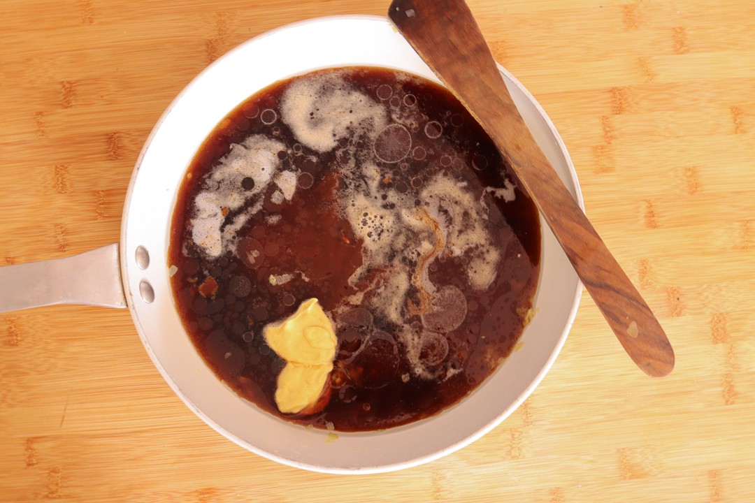 4. Pour Guinness, BBQ sauce honey, mustard and brown sugar. Bring to a boil and let simmer 10 minutes.