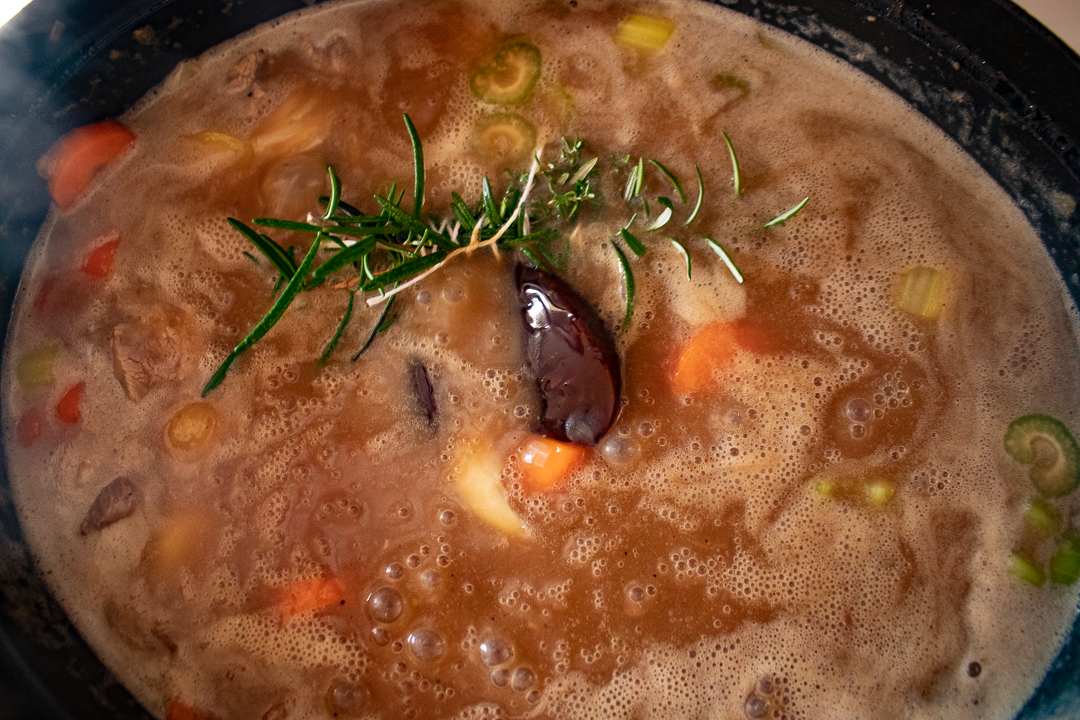 11. Pridajte bylinky a bujón. Varte približne 2 - 3 hodiny alebo dovtedy, kým mäso nie je úplne mäkké.