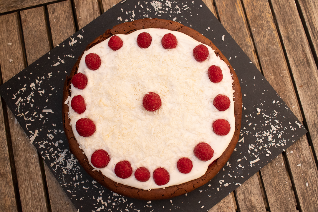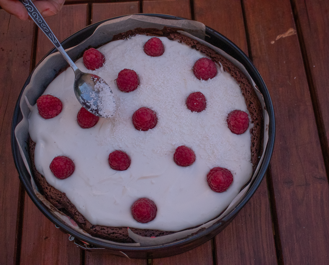 20. Tortu ozdobíme čerstvými malinami a posypeme strúhaným kokosom.