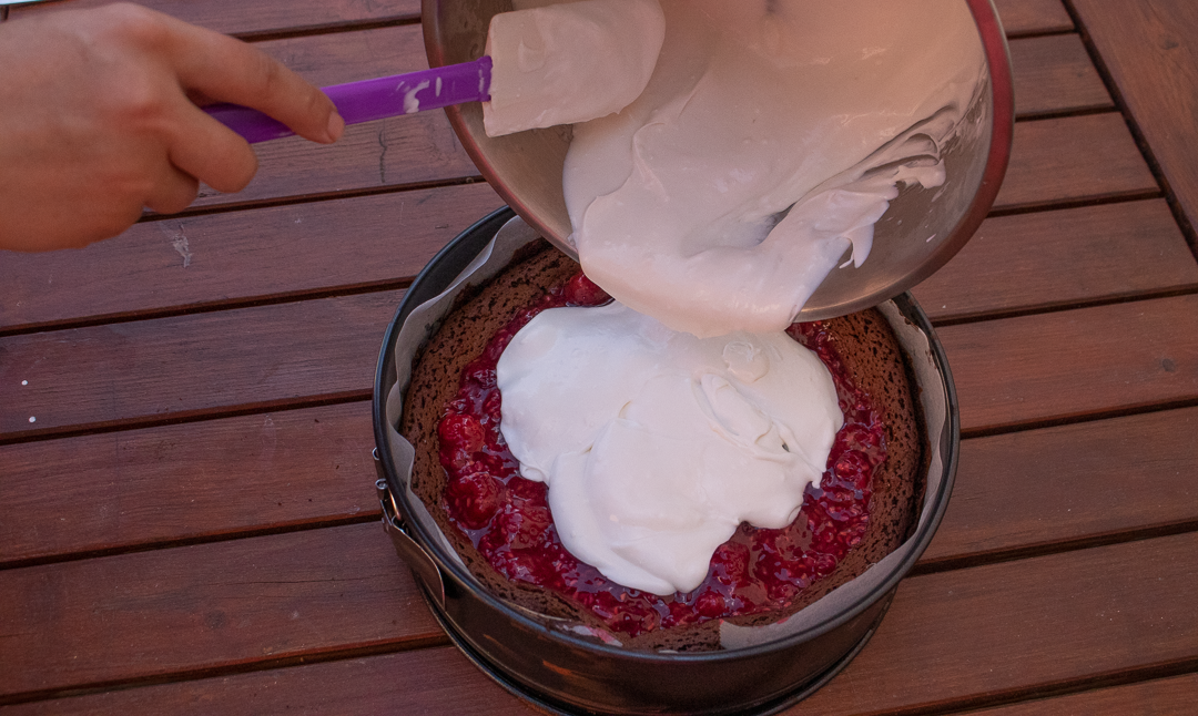 18. Vychladnutú malinovú zmes nalejme na vychladnutú čokoládovú tortu.