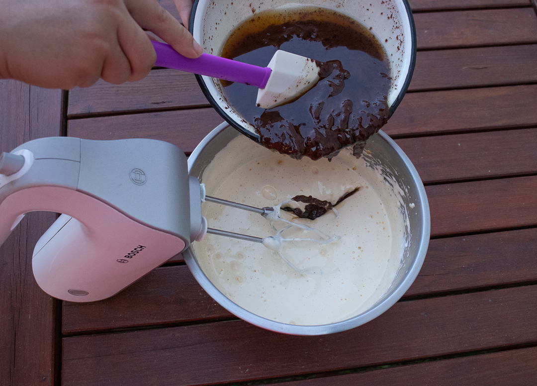6. Do rozšľahaných vajec pridáme vychladnutú čokoládovú zmes. Dobre premiešame.