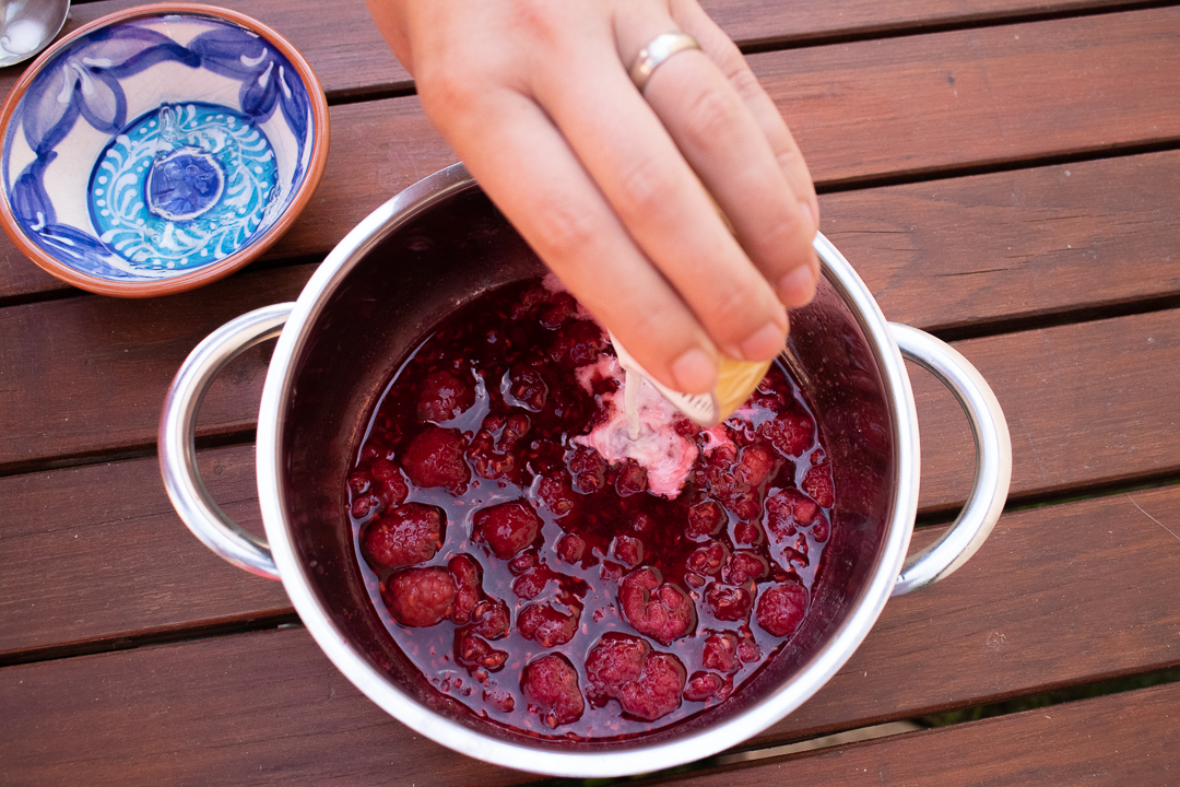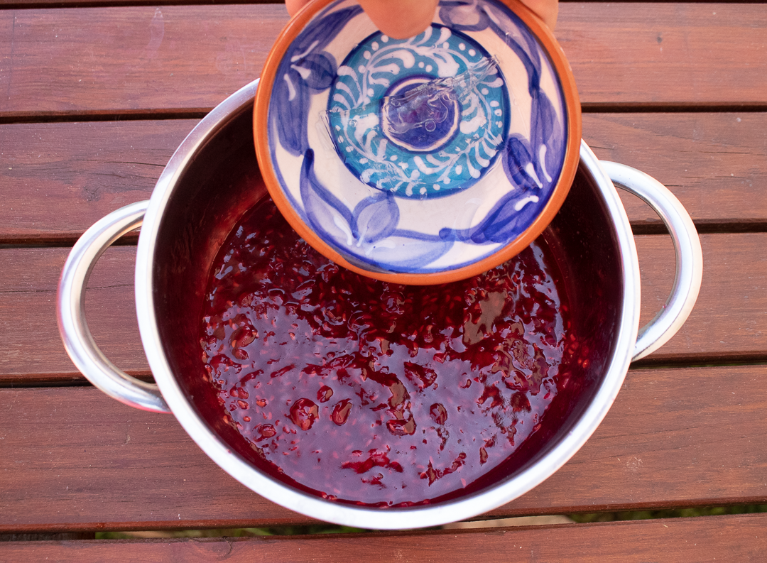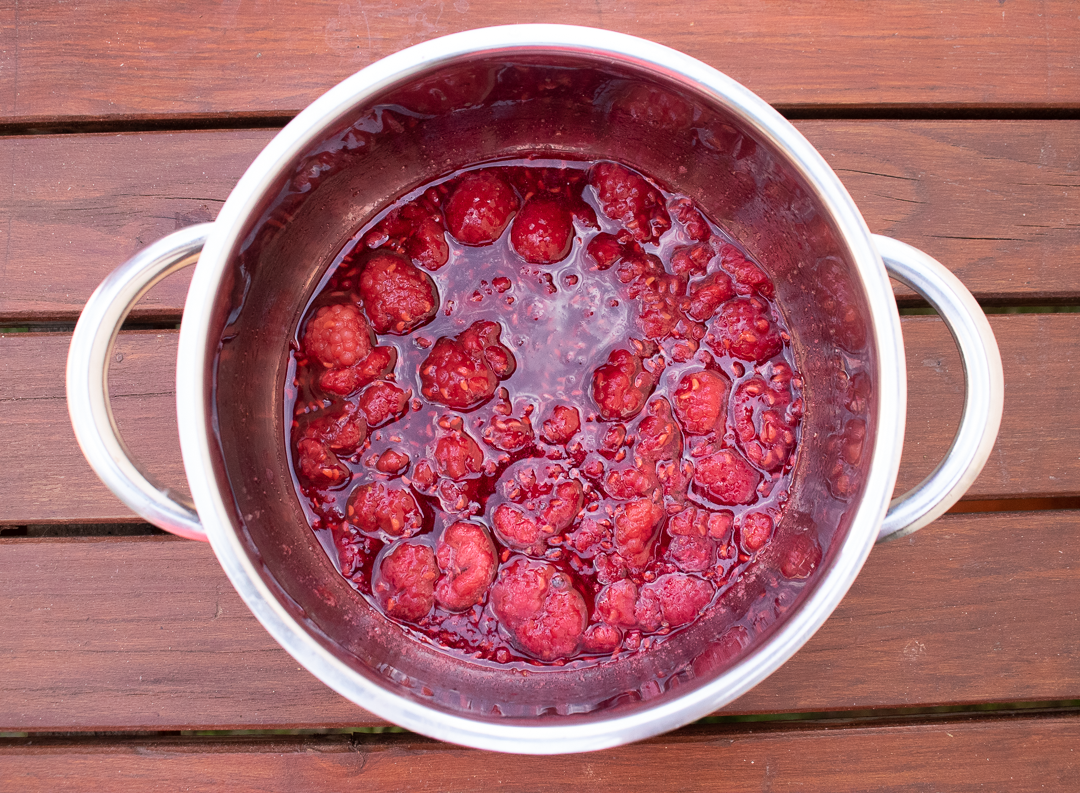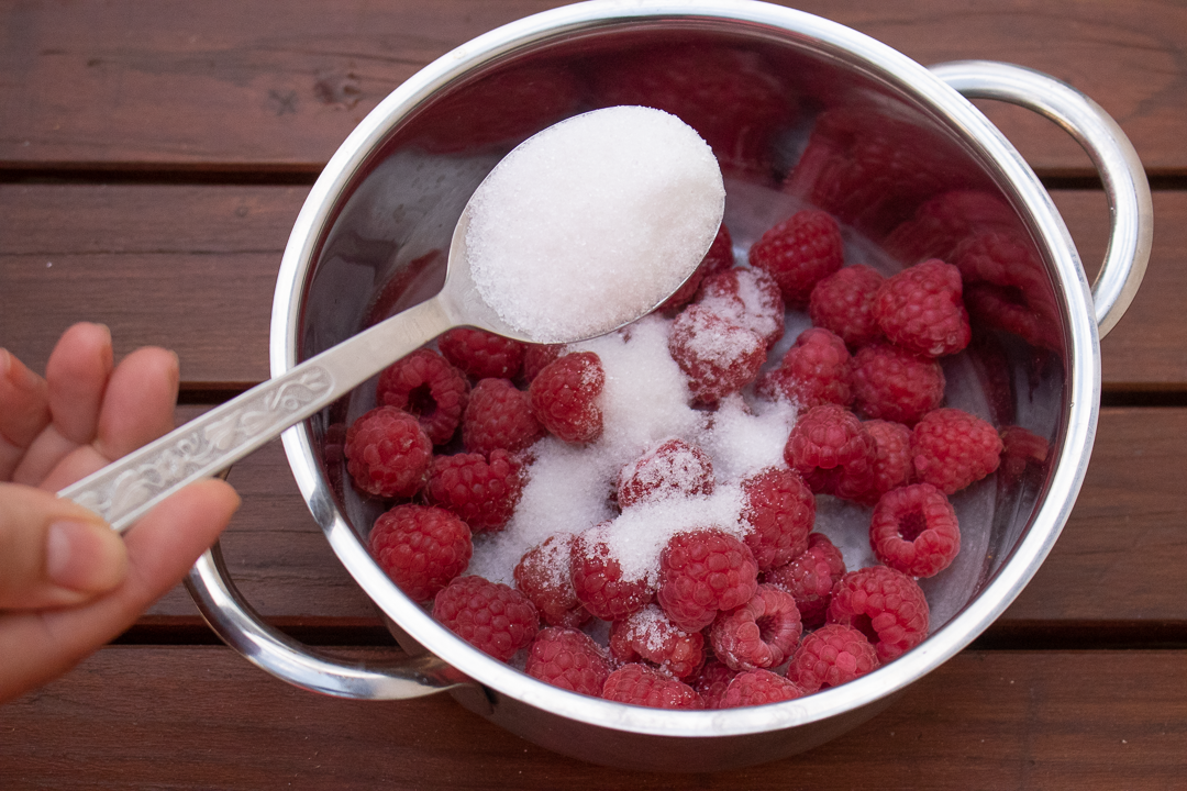 9. V menšom hrnci zohrejeme maliny a pridáme cukor. Privedieme do varu a varíme, kým sa cukor nerozpustí.