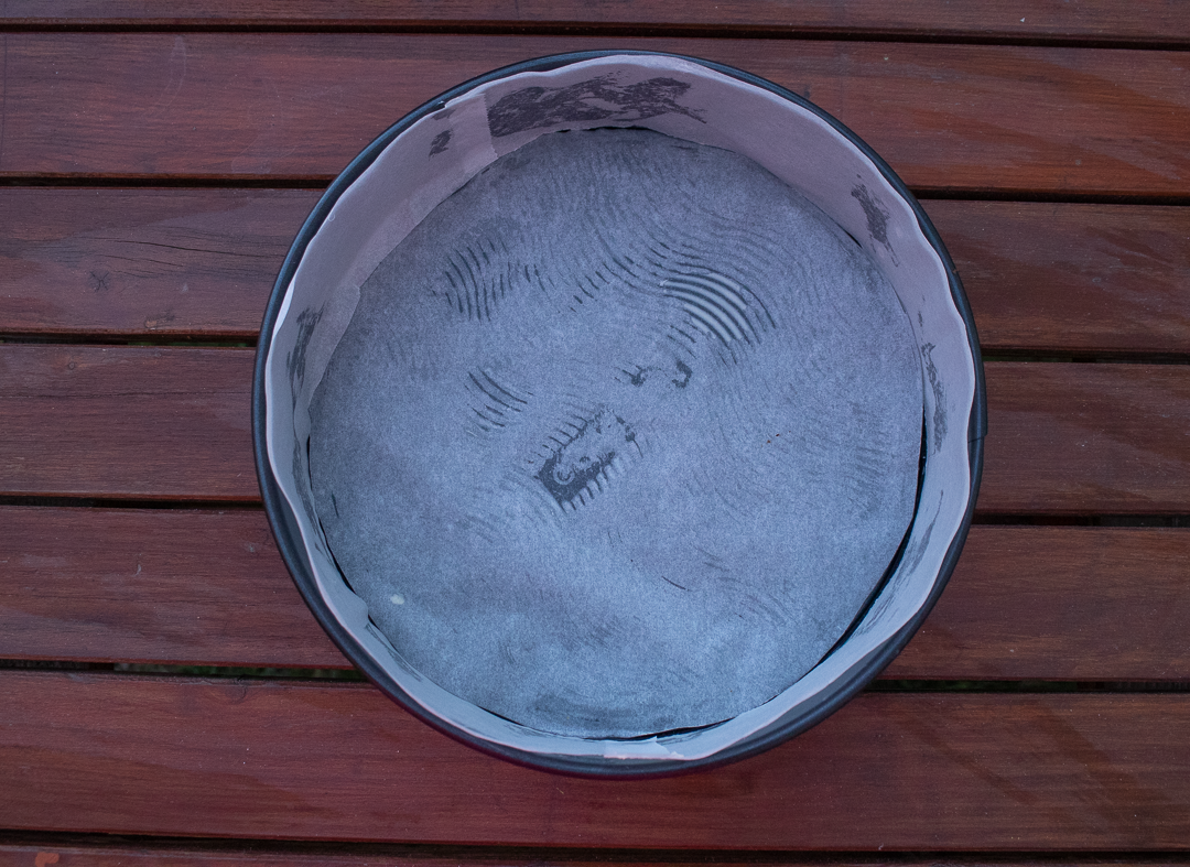 7. Tortovú formu (23 cm) vymastíme maslom a vystelieme papierom na pečenie. Cesto vylejeme do tortovej formy. Pečieme 40 minút pri 180 stupňoch.