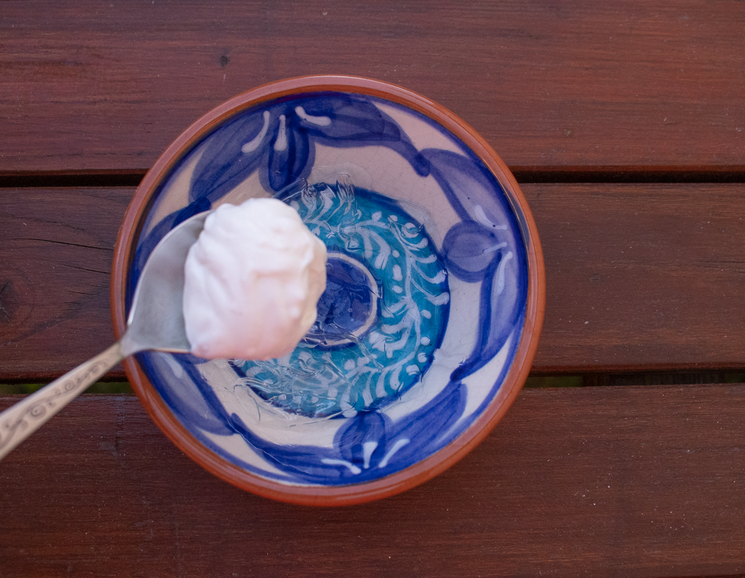 Keď je želatína vychladnutá, pridáme 2 lyžičky kokosového mlieka do rozpustenej studenej želatíny (toto je malý trik, aby sme sa vyhli hrudkám v kokosovom kréme).