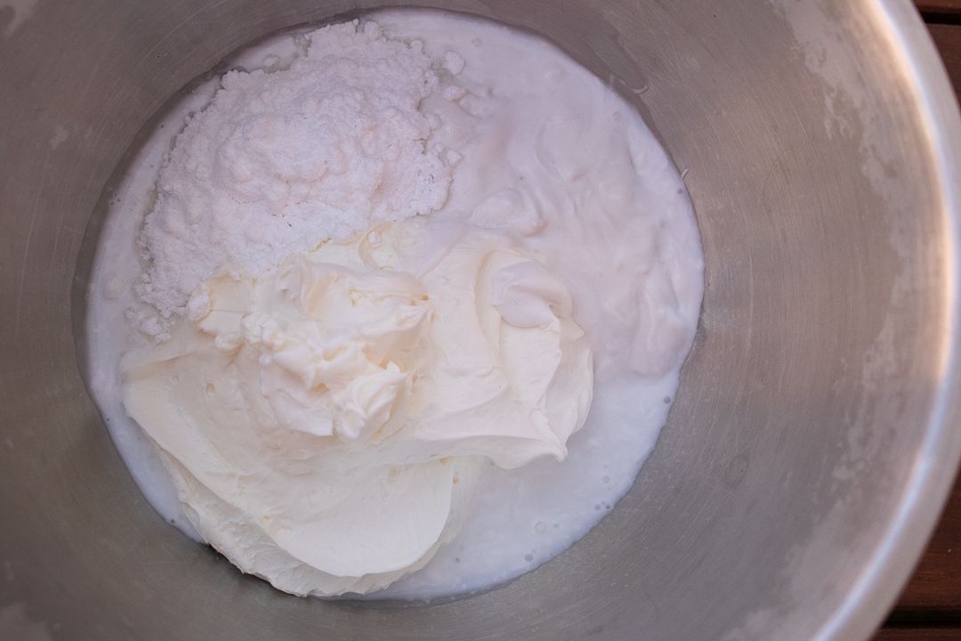15. Medzitým zmiešame mascarpone, kokosové mlieko, práškový cukor a kokosový likér.