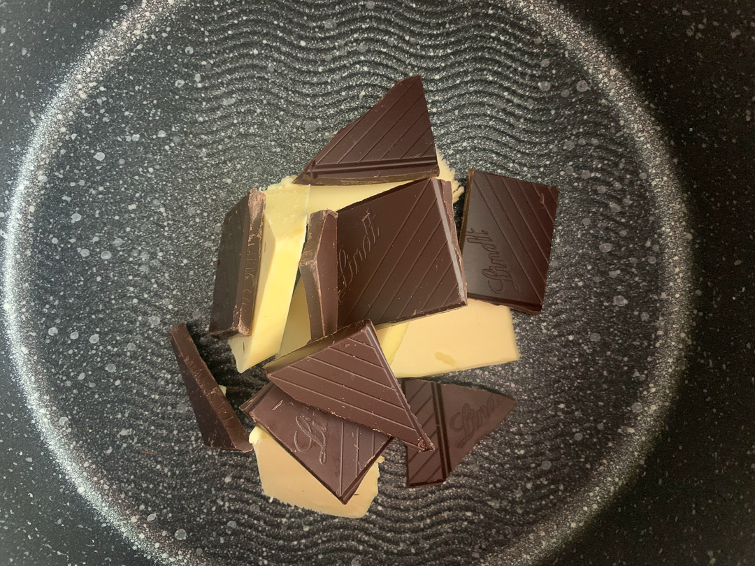 1. Čokoládu s maslom rozpustíme nad parou. Keď sa zmes rozpustí, pridáme mlieko a miešame, kým sa všetko neroztopí. Odložíme bokom. Necháme vychladnúť, ale zmes musí byť vlažná.
